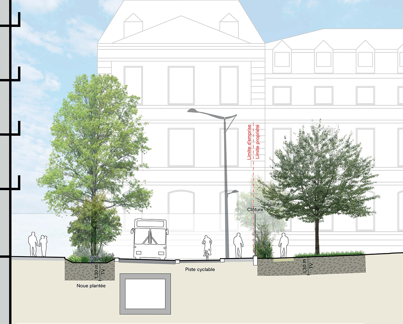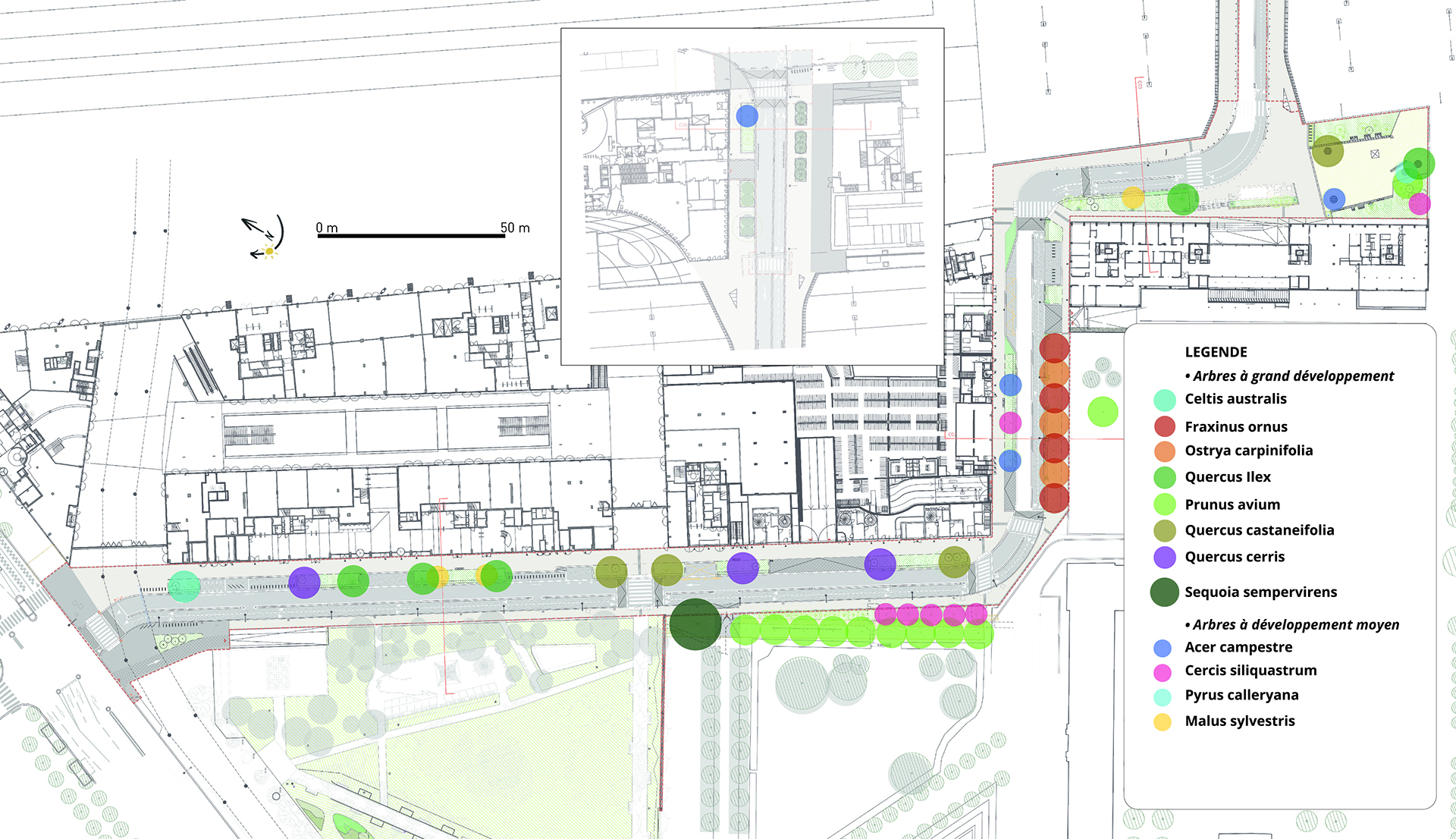 paysager riche et diversifié. Un traitement conçu pour animer les lieux tout au long de l’année, dialoguer avec son milieu et créer des ambiances qui lui sont propres afi n de marquer l’identité de cette nouvelle rue.