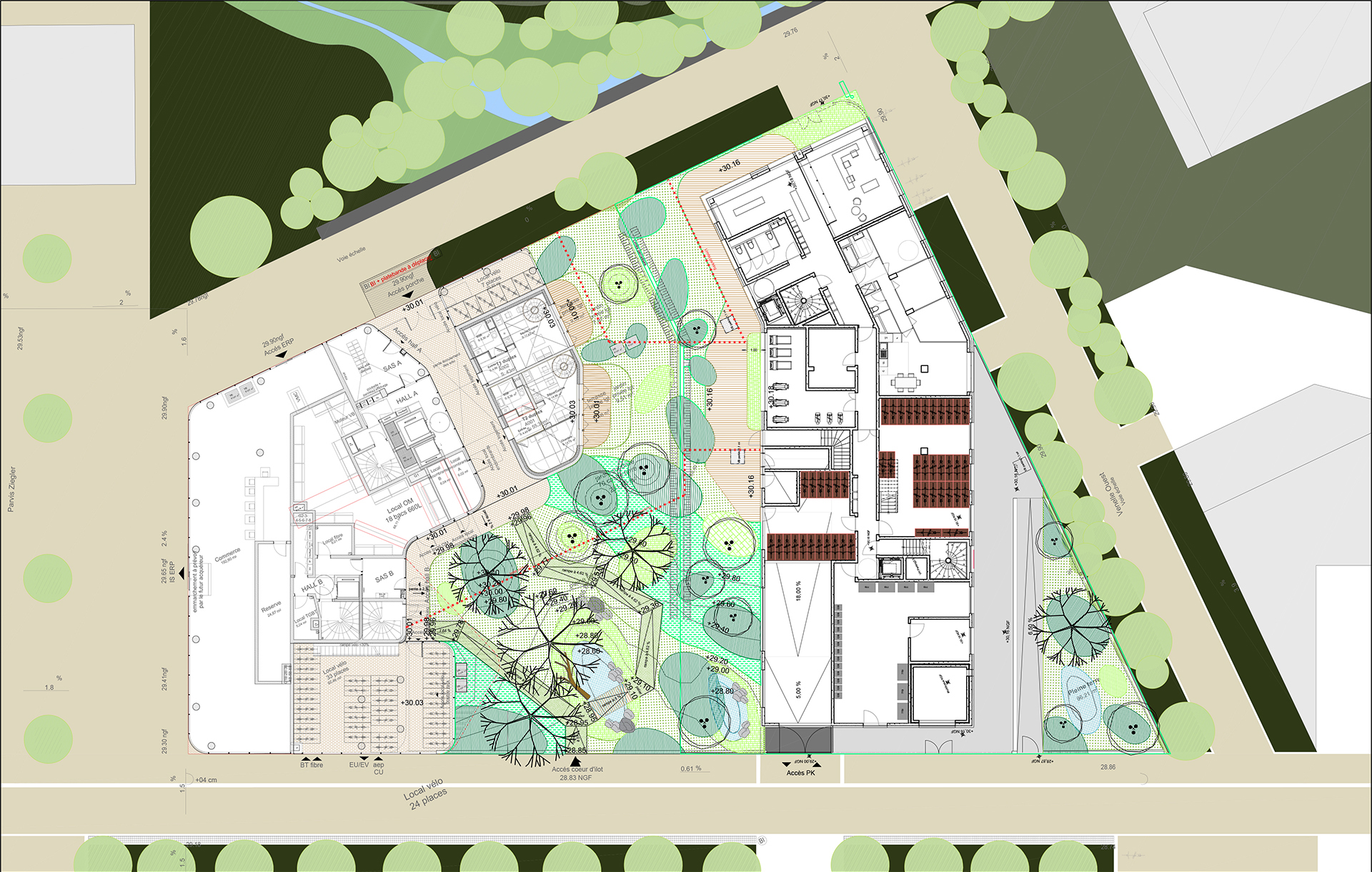Sur 2 lots contigus, le promoteur souhaite une unité paysagère entre eux. Le projet paysager va venir effacer les limites parcellaires et offrir un traitement paysager identique en cœur d’îlot,
