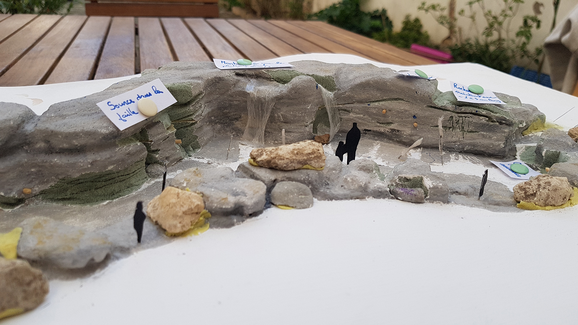 Elément structurant du parc de l’oiseau, la fontaine-canyon est un lieu attractif souvent envahie par les enfants. Longue de 35m et haute par endroit de 3m, la fontaine-canyon est réalisée en béton décoratif imitant une falaise. De ses aspérités, creux et failles, jailli de l’eau sous différentes formes.