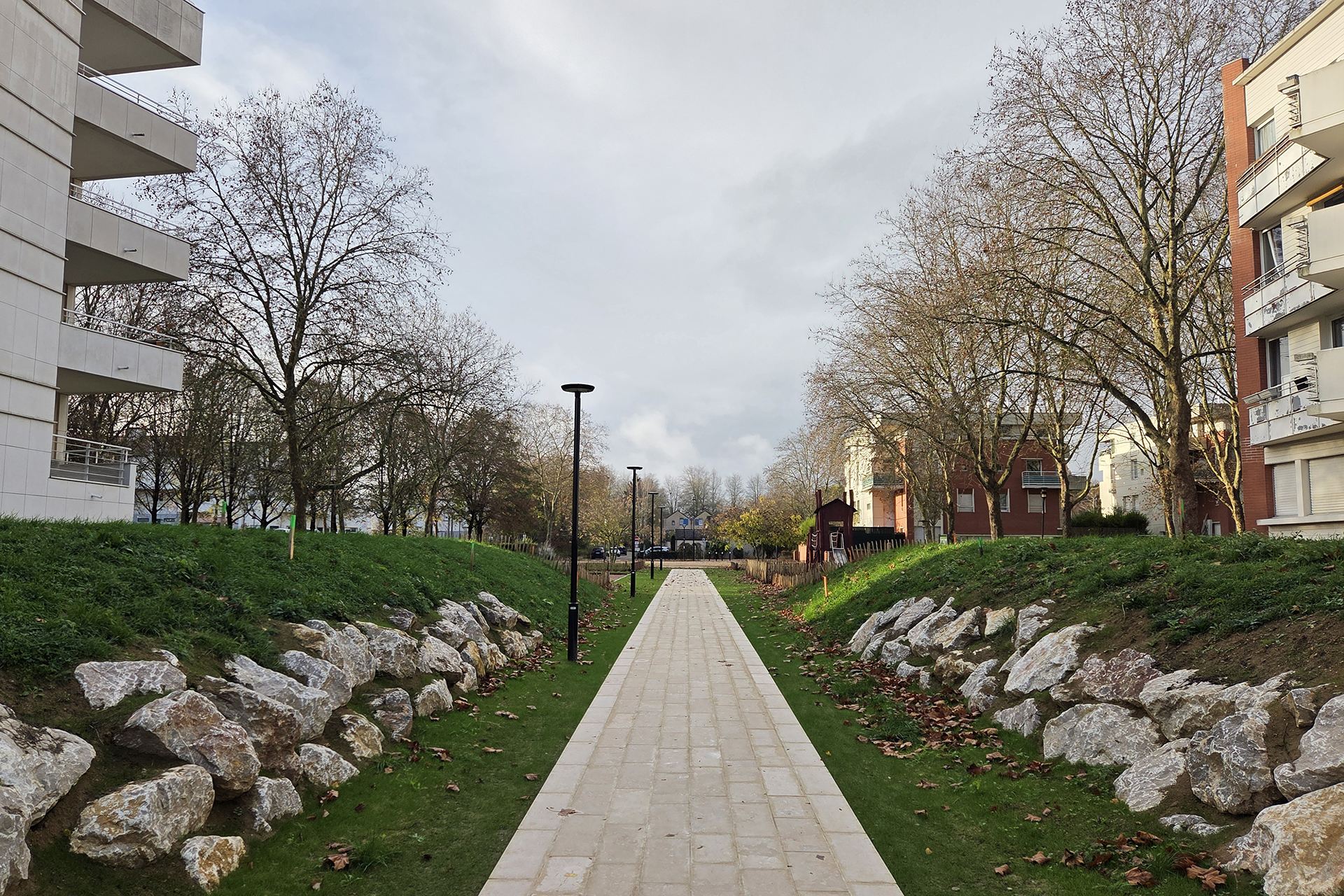Aujourd’hui, ce parc construit dans les années 90 est caché au cœur d’un vaste quartier d’habitation. Sa réhabilitation va lui permettre de se dévoiler.