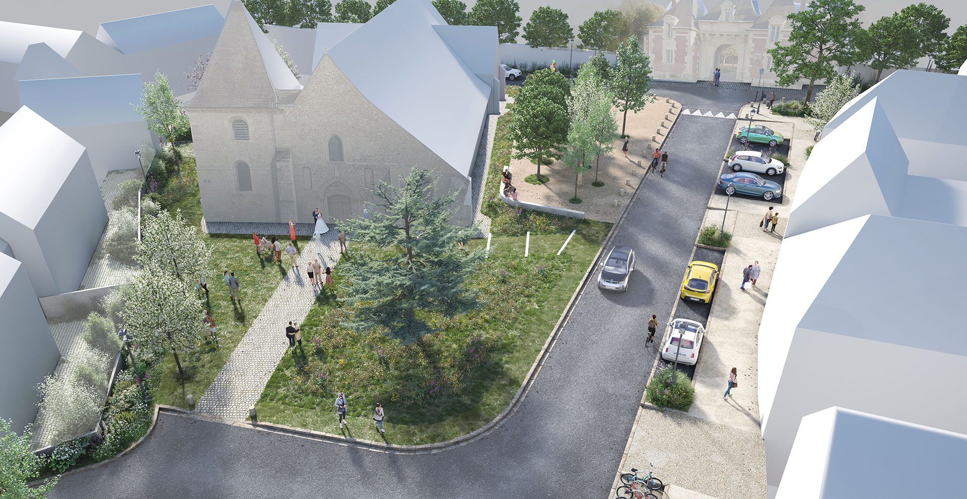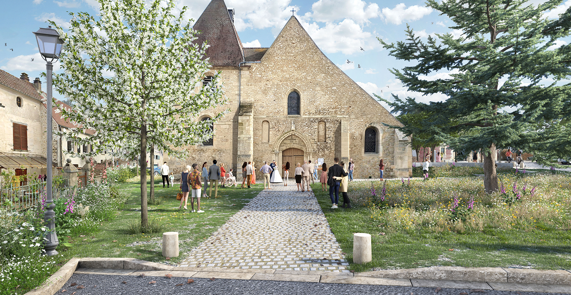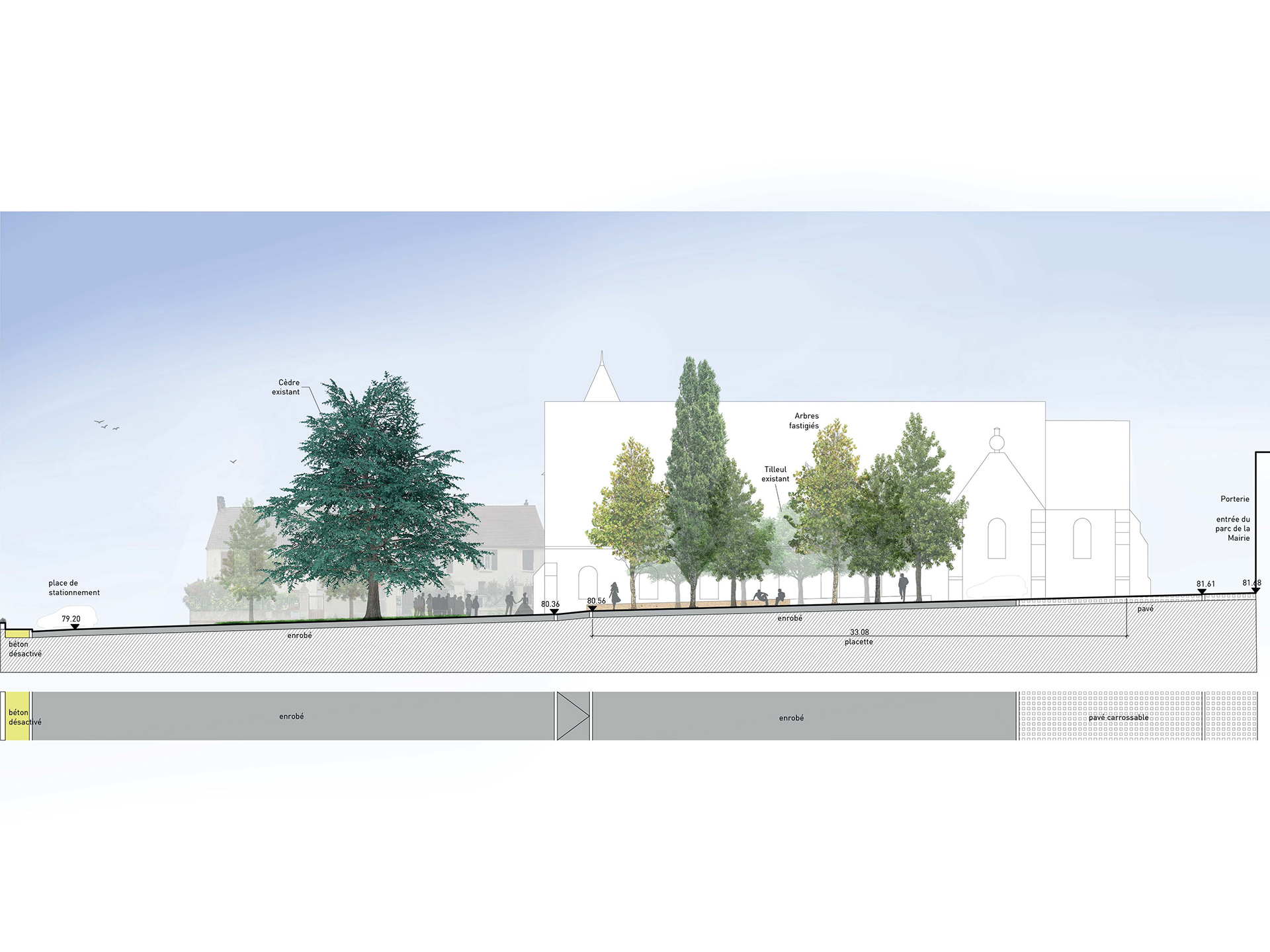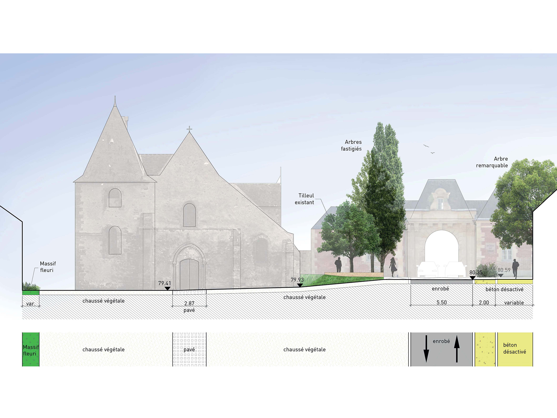 Au cœur du vieux bourg, la place abrite une église romane et une porterie datant de la renaissance. Autrefois, lieu d’échange la place aujourd’hui subit le dictat de la voiture. Omniprésente, elle disqualifie le site. Le projet va permettre de retisser des liens :