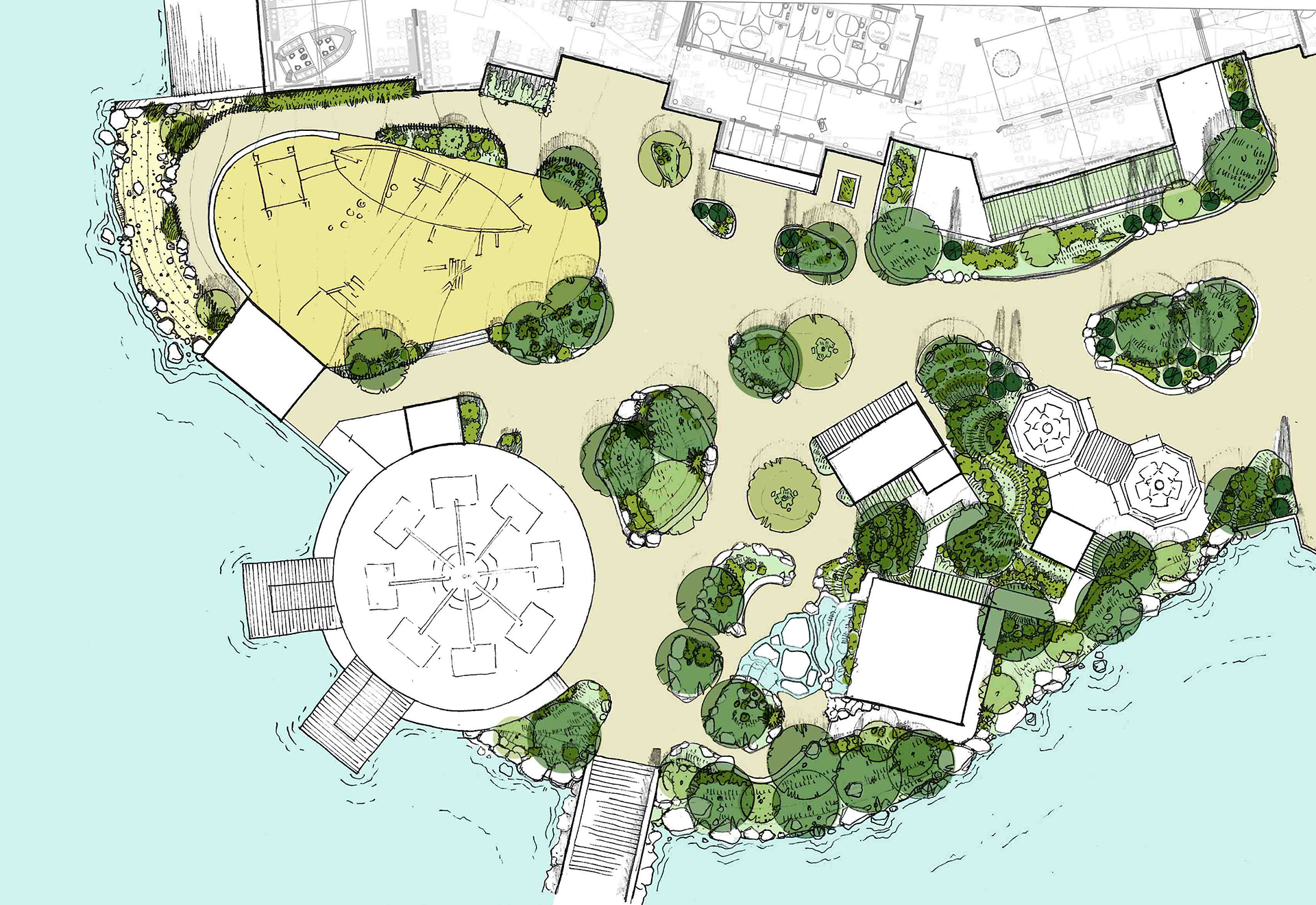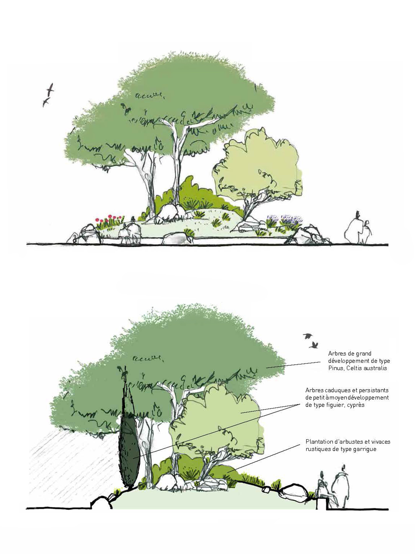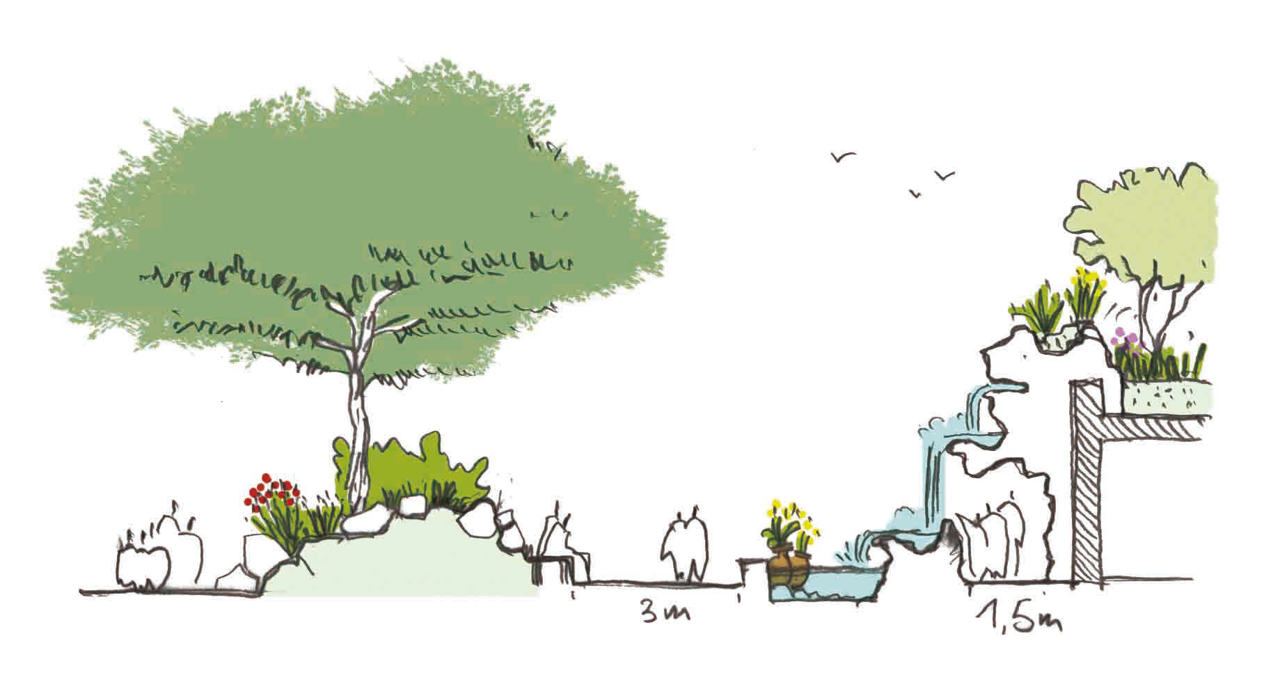 Le traitement paysager de la zone doit répondre à plusieurs fonctions : souligné par la palette végétale la thématisation de la zone ; apporter de l’ombre grâce à la plantation de nombreux arbres ; mettre en valeur la façade de ce grand restaurant.
