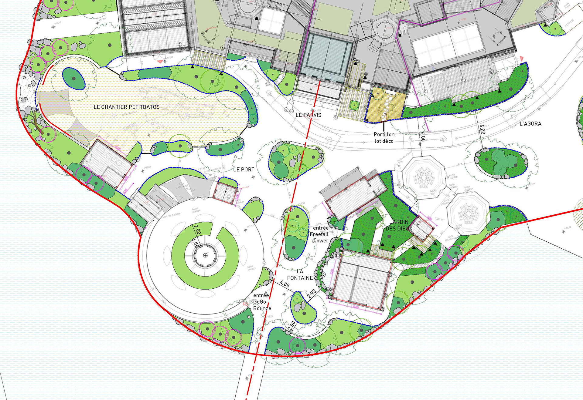 L’agence a participé pleinement à la scénographie paysagère du projet en échange constant avec la direction artistique et technique du parc.